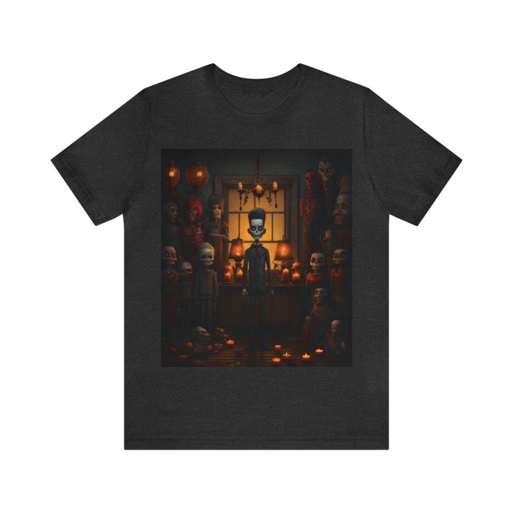 Stepping into the realm of the mysterious, this Ruby Wear spooky design invites you into a dimly lit room where a skeletal soirée is in seemingly in full swing. Amidst the bony crowd, one dapper skeleton, suited up and ready to party, stands staring at you. But wait, is that a candlelit dance party or a macabre meeting?