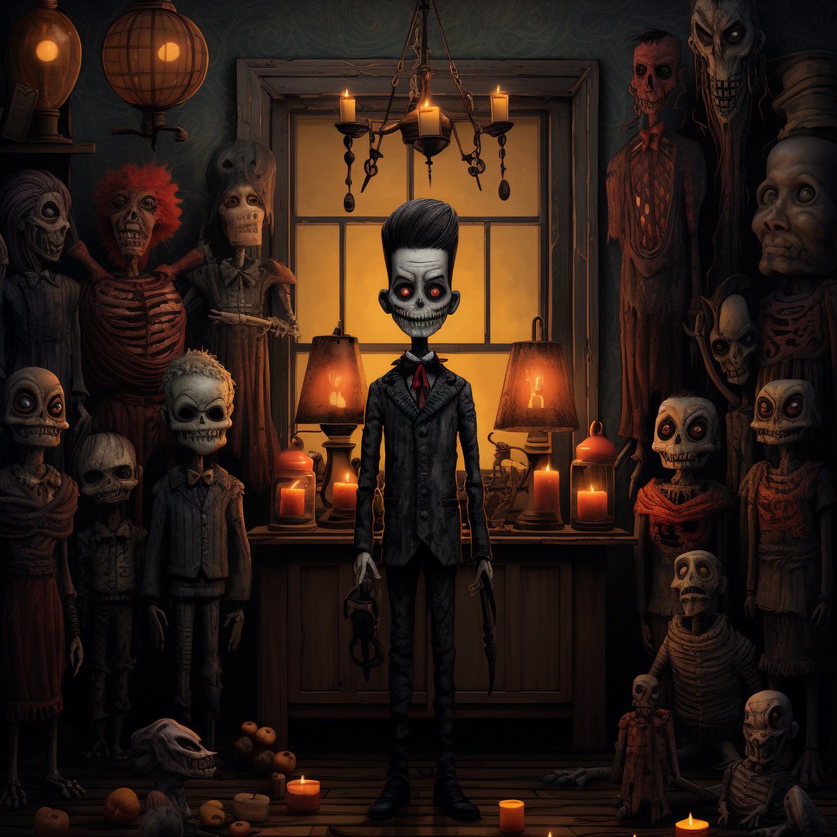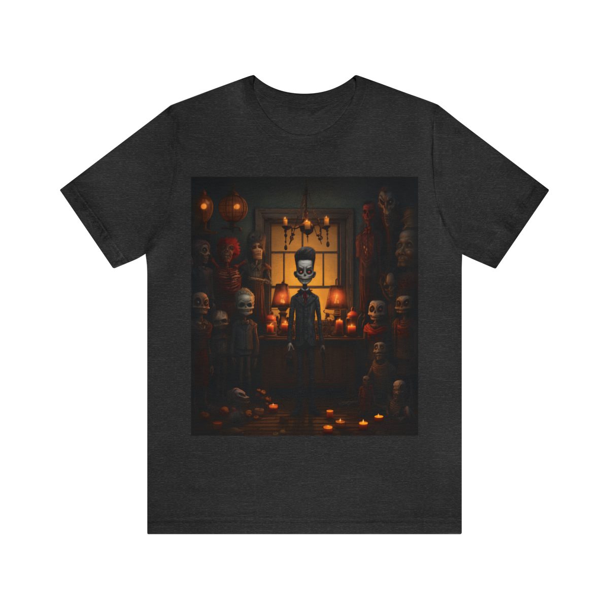 Stepping into the realm of the mysterious, this Ruby Wear spooky design invites you into a dimly lit room where a skeletal soirée is in seemingly in full swing. Amidst the bony crowd, one dapper skeleton, suited up and ready to party, stands staring at you. But wait, is that a candlelit dance party or a macabre meeting?
