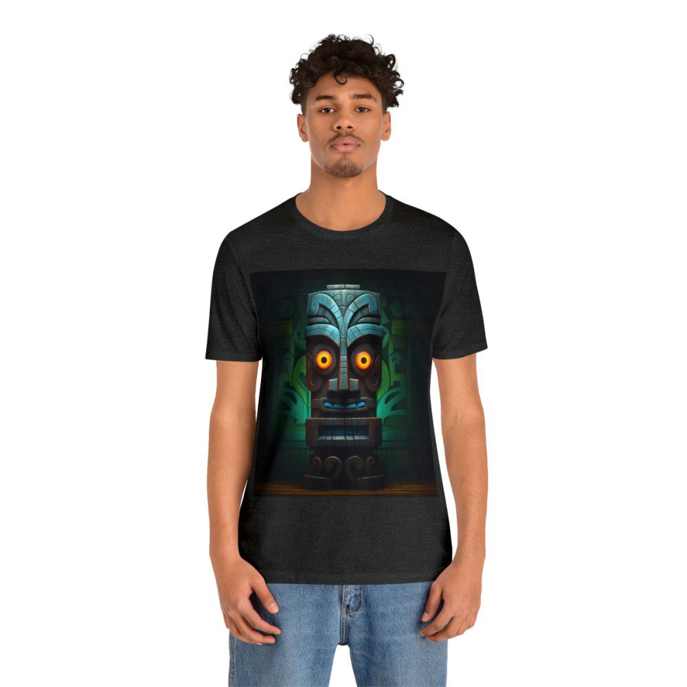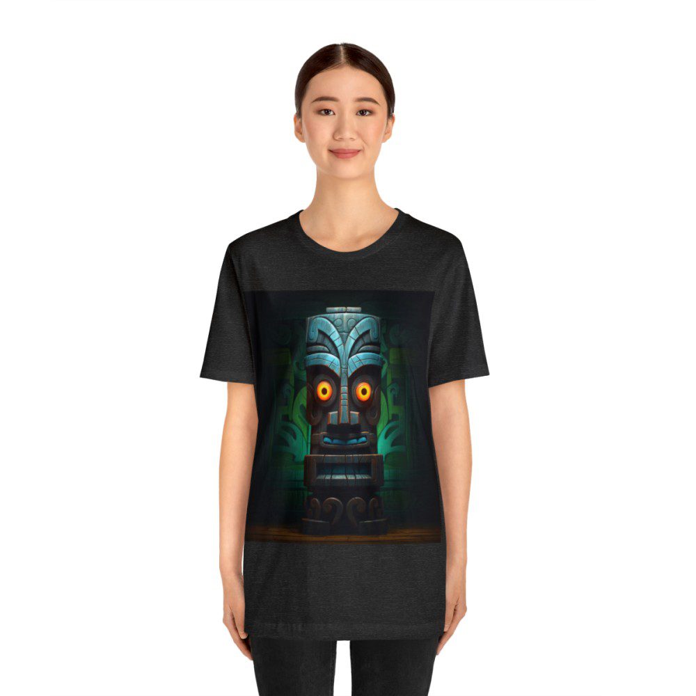 Step into a realm where every shadow tells a tale! Front and center, a brightly colored, intricately carved tiki statue stands guard. Its charming allure is heightened by the surrounding darkness. But there’s more to this story: a playful yet unsettling face with striking blue teeth and piercing orange eyes seemingly watch your every move waiting to reveal the mysteries it holds… or to shoot you with an air dart. Indubitably, one of those.