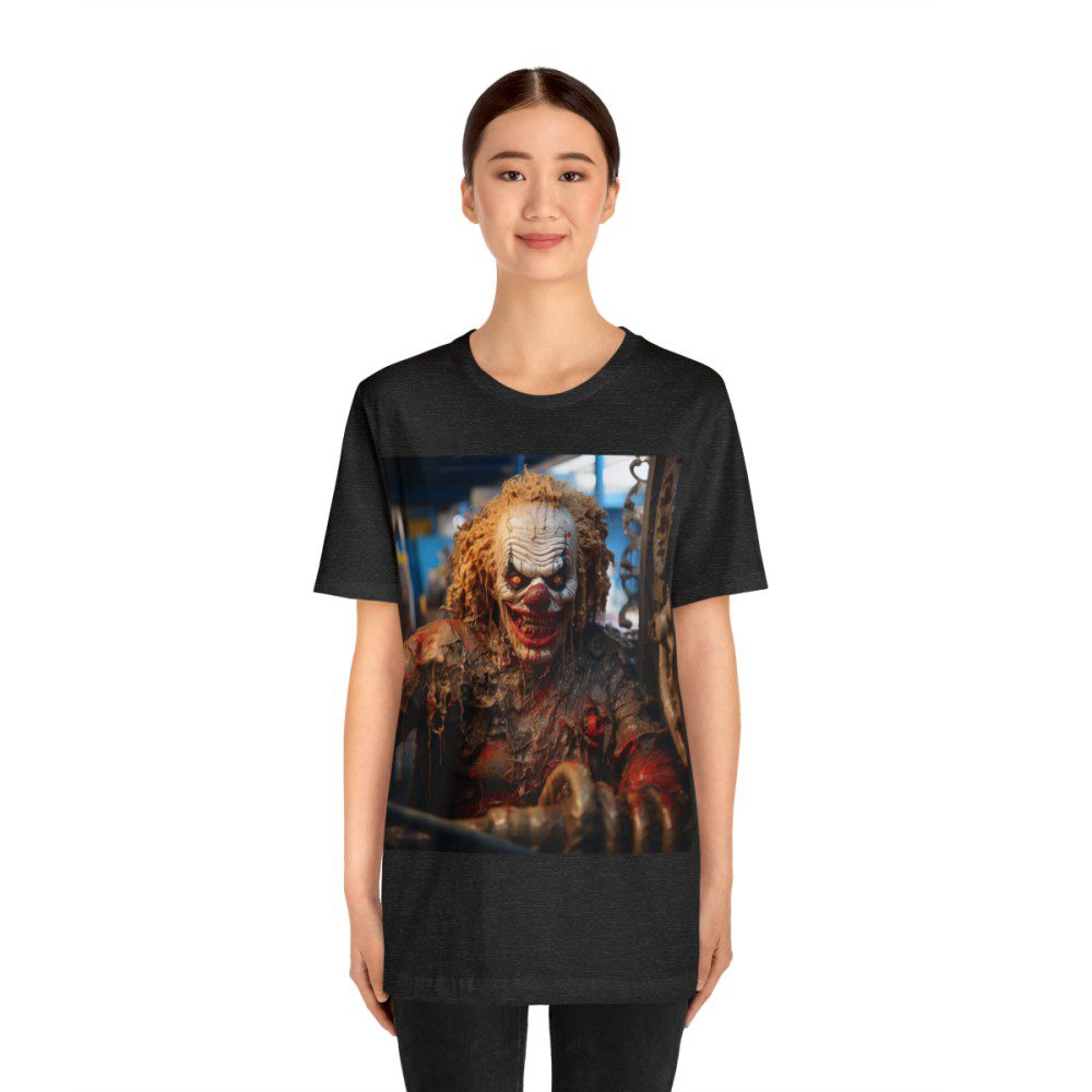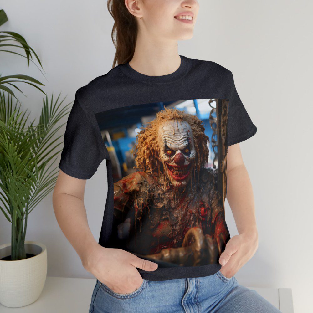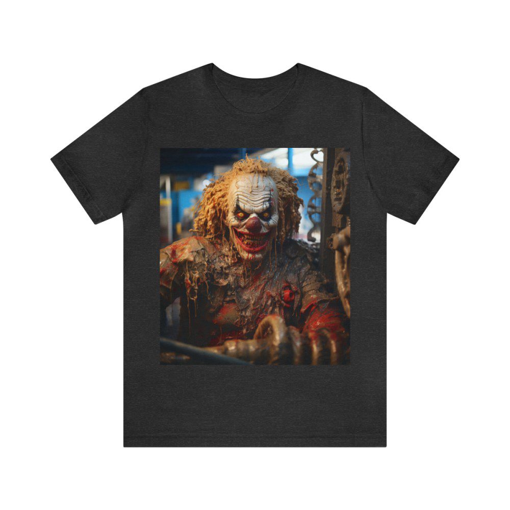 This clown definitely isn’t part of a circus! He’s a dirty, smelly renegade, and staring at him as he stares at you, you’re not quite certain whether a person is under the mask or if it’s just some sinister statue. — You’ll be creeping out everyone everywhere you wear this shirt!