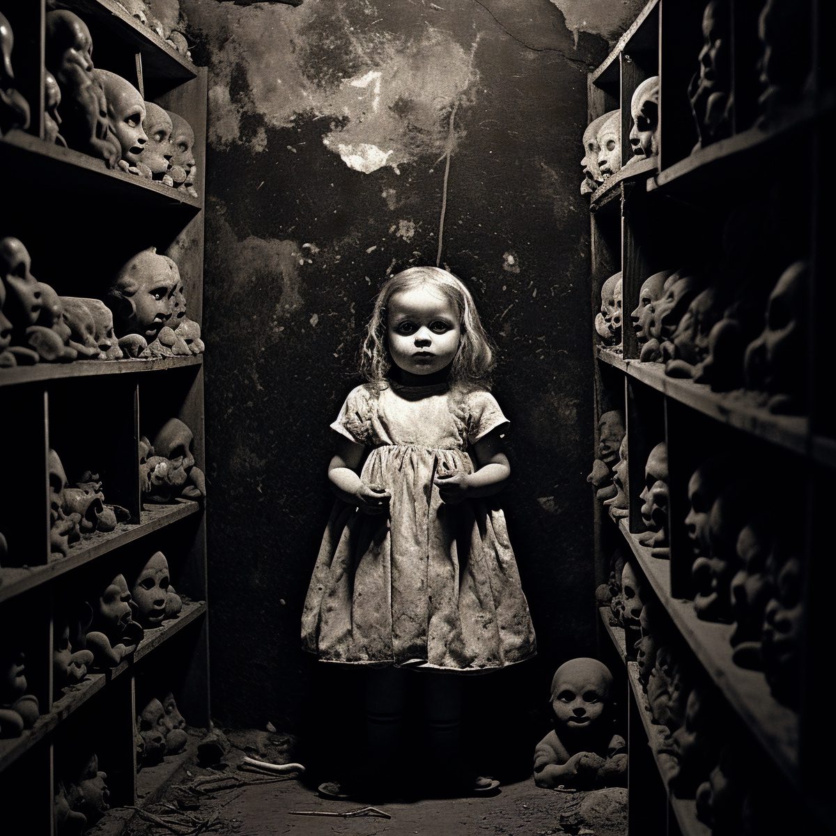 Step into a room where stories linger in the shadows. Amidst the chilling collection of lifeless doll heads, a young girl in an elegant gown stands as a beacon of innocence, her serene gaze a stark contrast to the macabre surroundings. — What stories does this photo (and this shirt) hold?