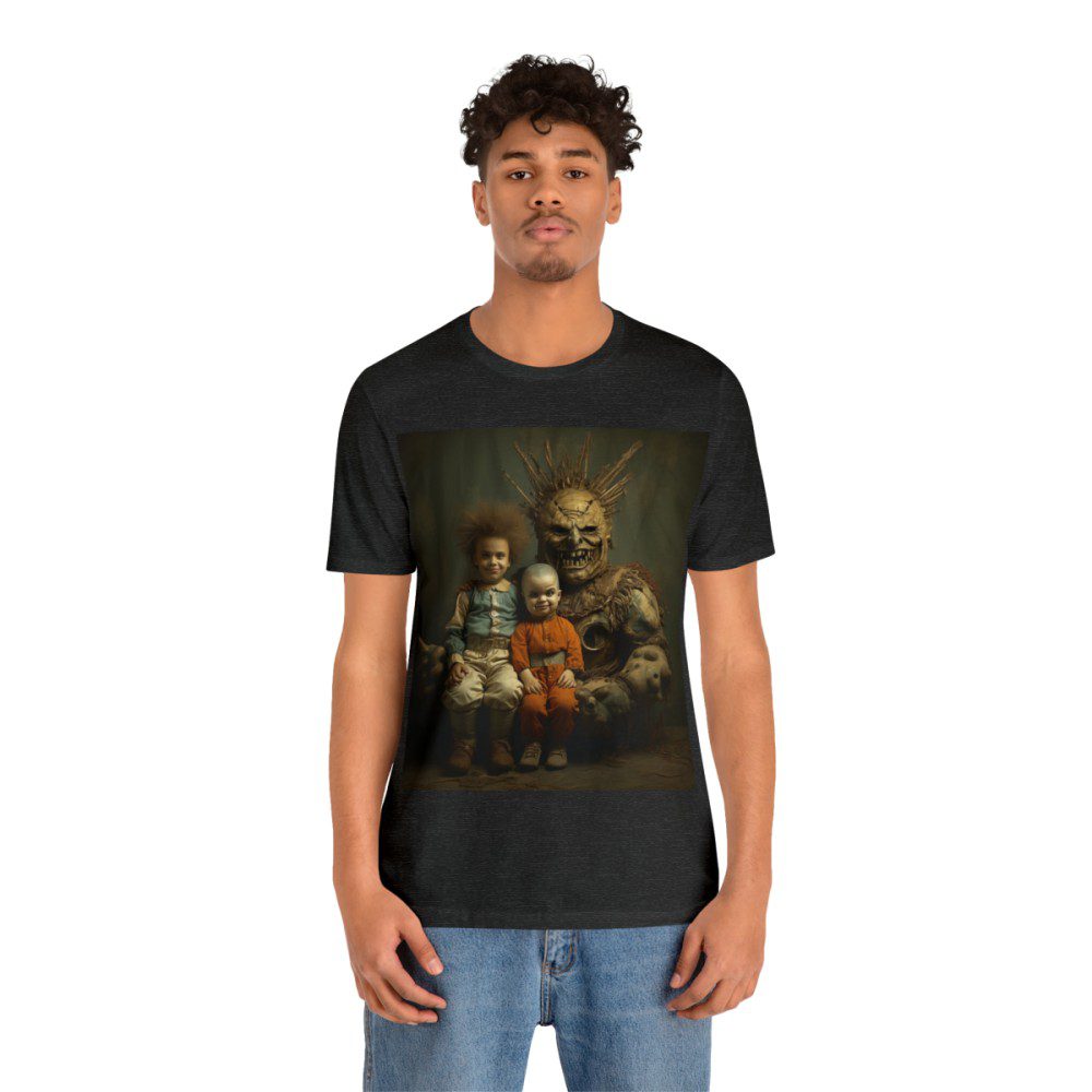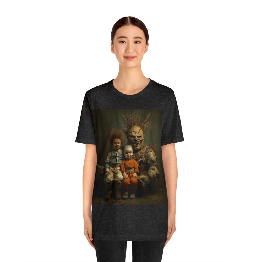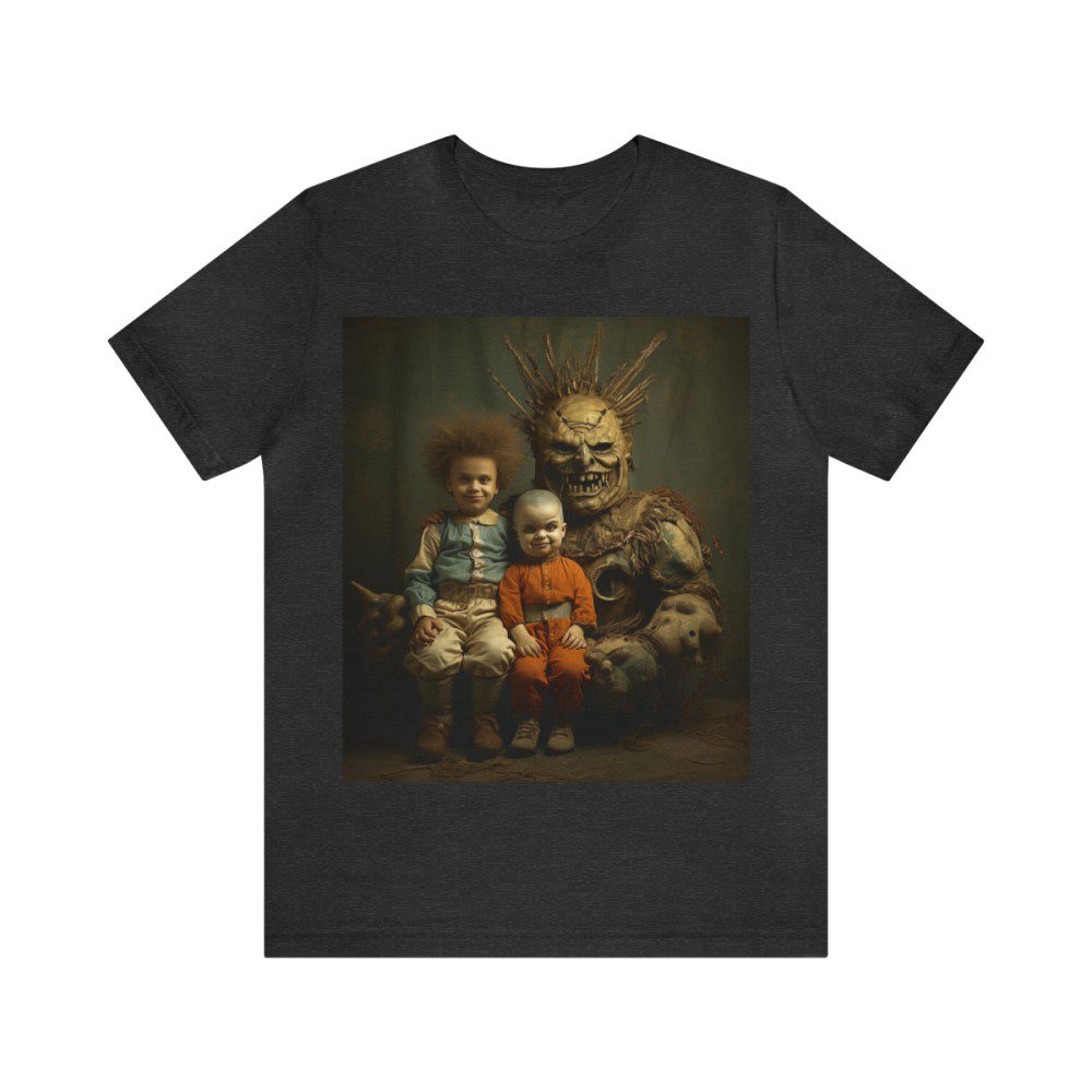 Most Ruby Wear shirts are designed to pique your curiousity and to leave you with a few questions. This one takes the cake as you’ll be wondering everything from “What’s going on?” to “Is that a little person?” to “Is that a statue? A statue of what?” to “What country is this in?” to “When was this?” to “Is that a chair?” and on and on. — The questions could go on all night!