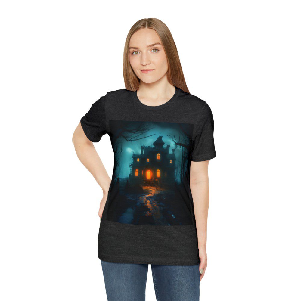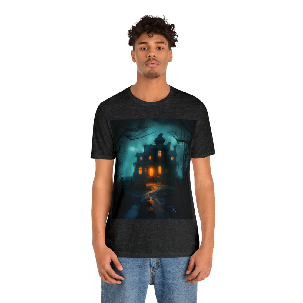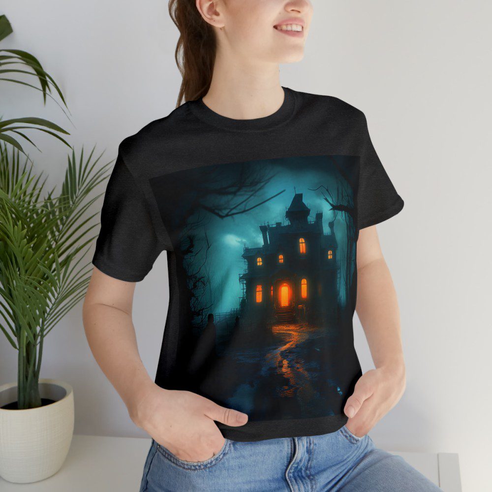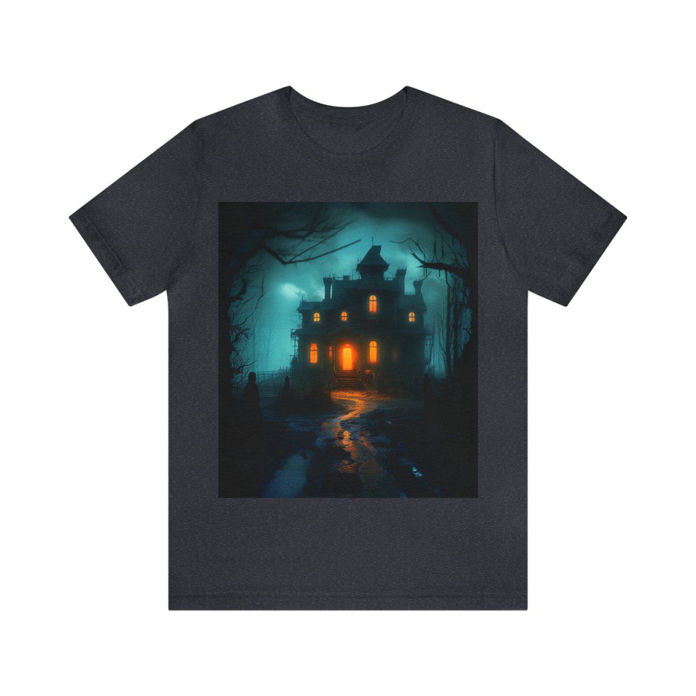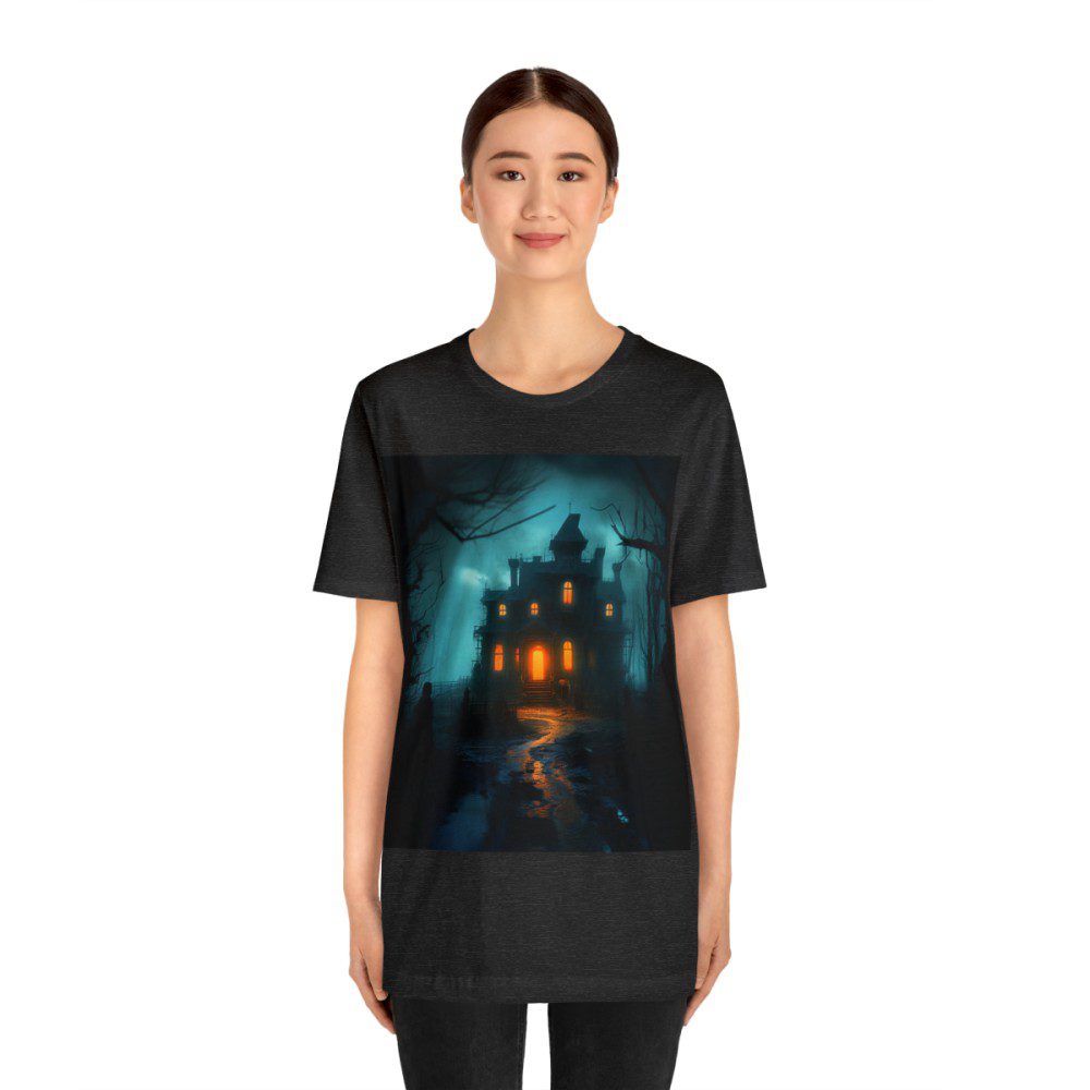 On a spooky, dark night, an eerie fog glows around an old ramshackle house. Warm orange hues illuminate the windows as cemetery headstones flank the wet, muddy road.