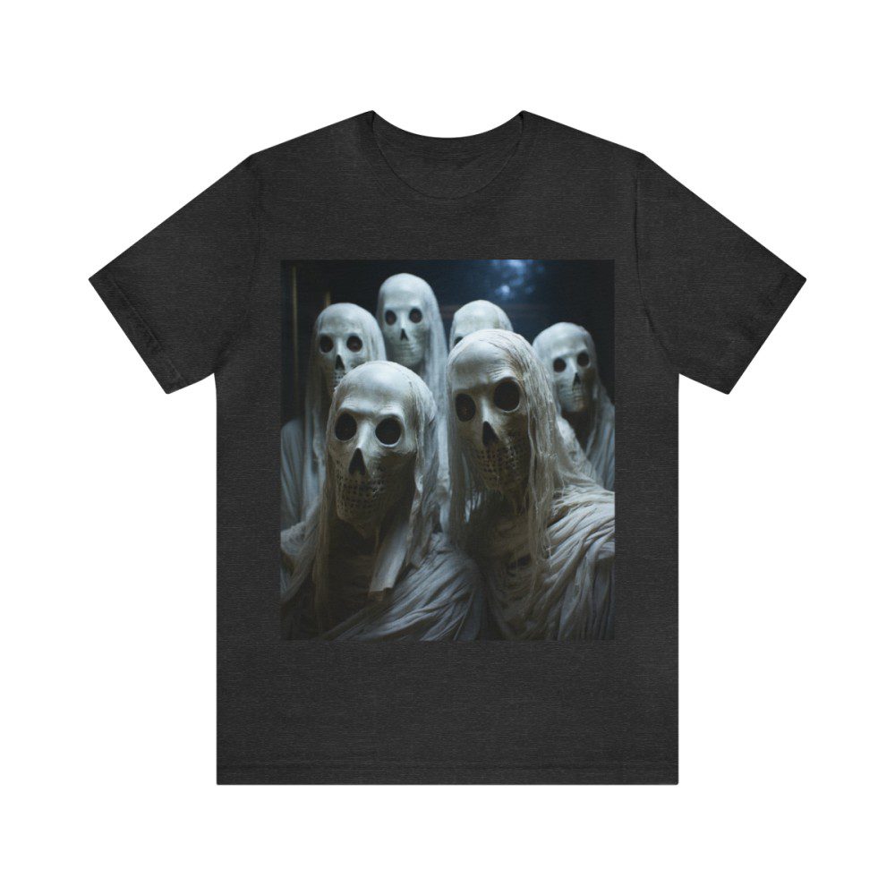Step into a realm of mystery and intrigue with this captivating collection of ethereal skeleton-men draped in flowing robes. As the masked figures beckon you closer, their secrets remain hidden behind their white masks. — With this shirt, you’re not just wearing an image; you’re donning a tale of the unknown, inviting everyone you meet to unravel the mystery… and to be a bit scared with you, too!