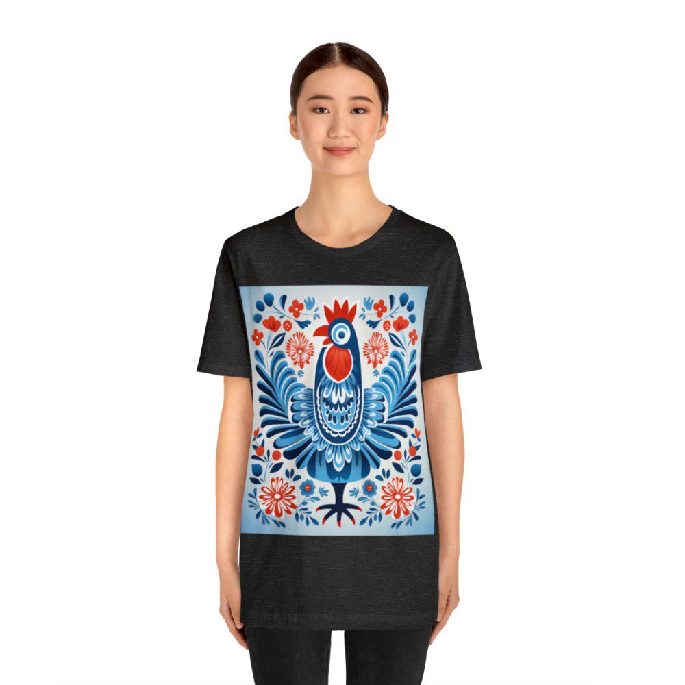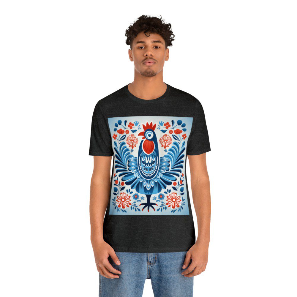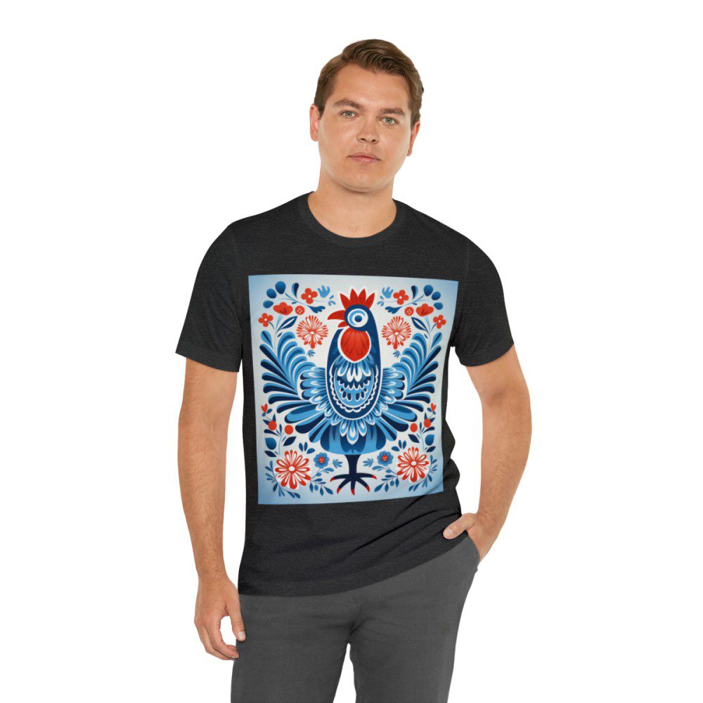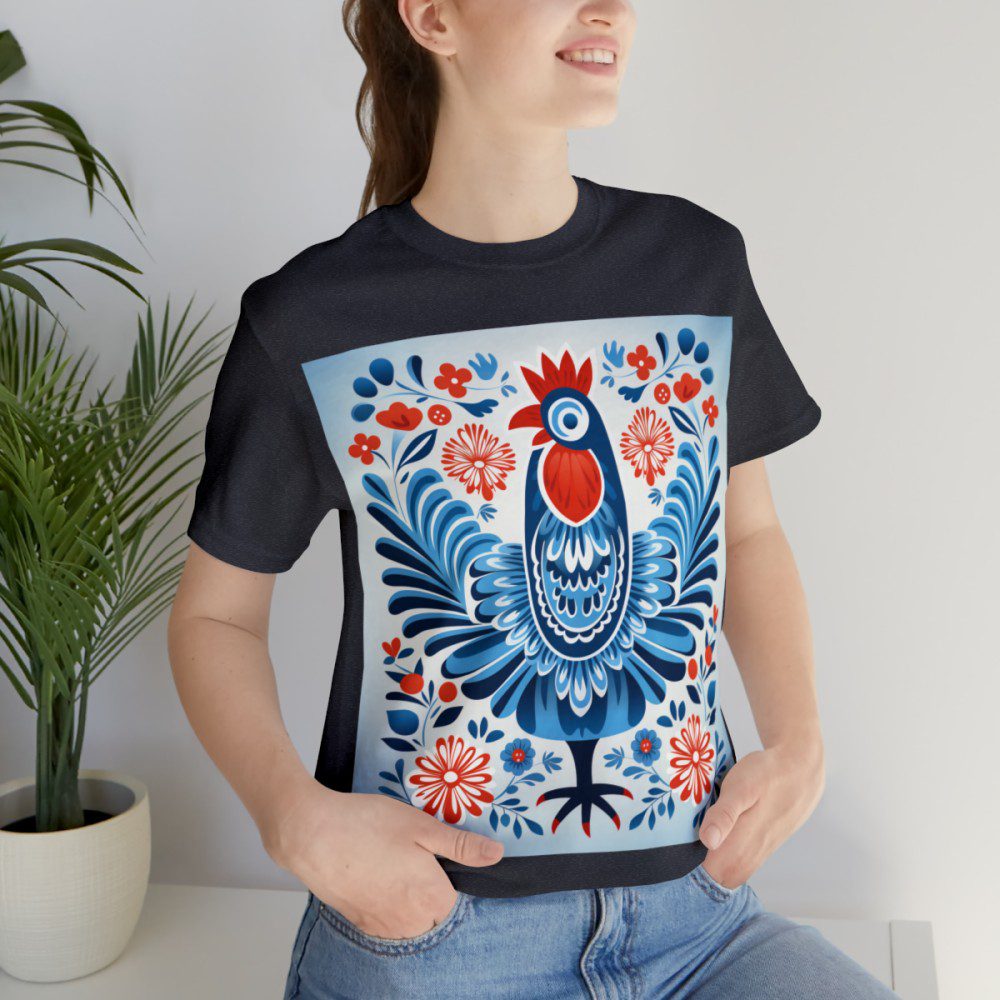 This striking rooster, adorned in brilliant shades of blue and red, leaps off a pristine canvas, capturing your heart in every meticulous feather detail. With a fierce gaze and a regal twirl, it’s not just a bird — it’s a statement piece. Don this shirt and let the world see the vibrant dance of folklore come alive, chicken style, and invite onlookers to join in the rhythm of a captivating tale.