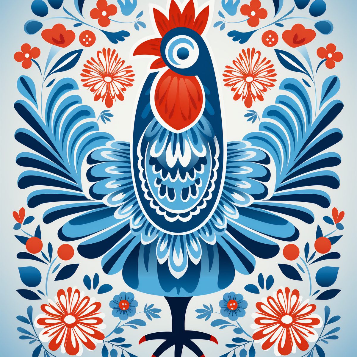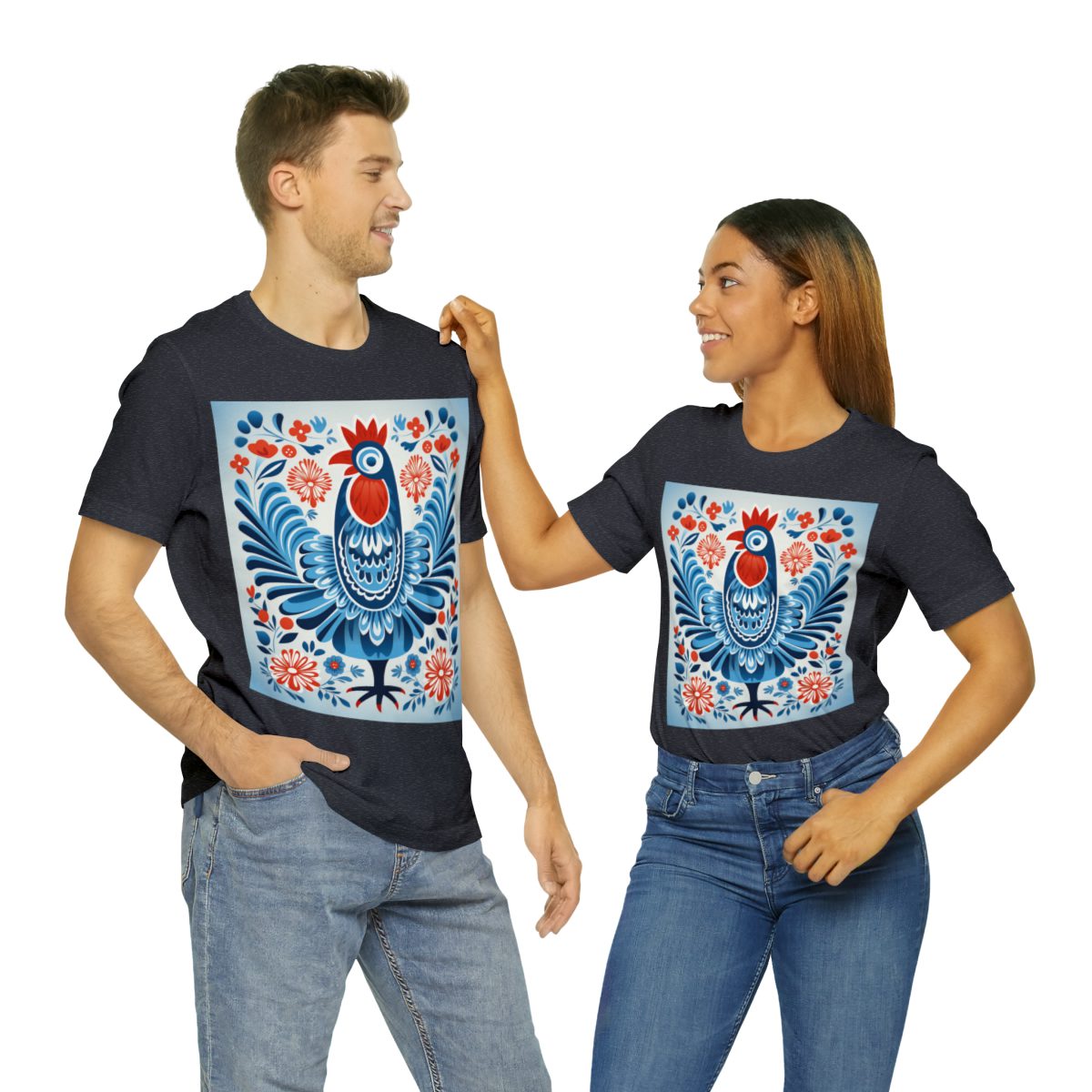 This striking rooster, adorned in brilliant shades of blue and red, leaps off a pristine canvas, capturing your heart in every meticulous feather detail. With a fierce gaze and a regal twirl, it’s not just a bird — it’s a statement piece. Don this shirt and let the world see the vibrant dance of folklore come alive, chicken style, and invite onlookers to join in the rhythm of a captivating tale.