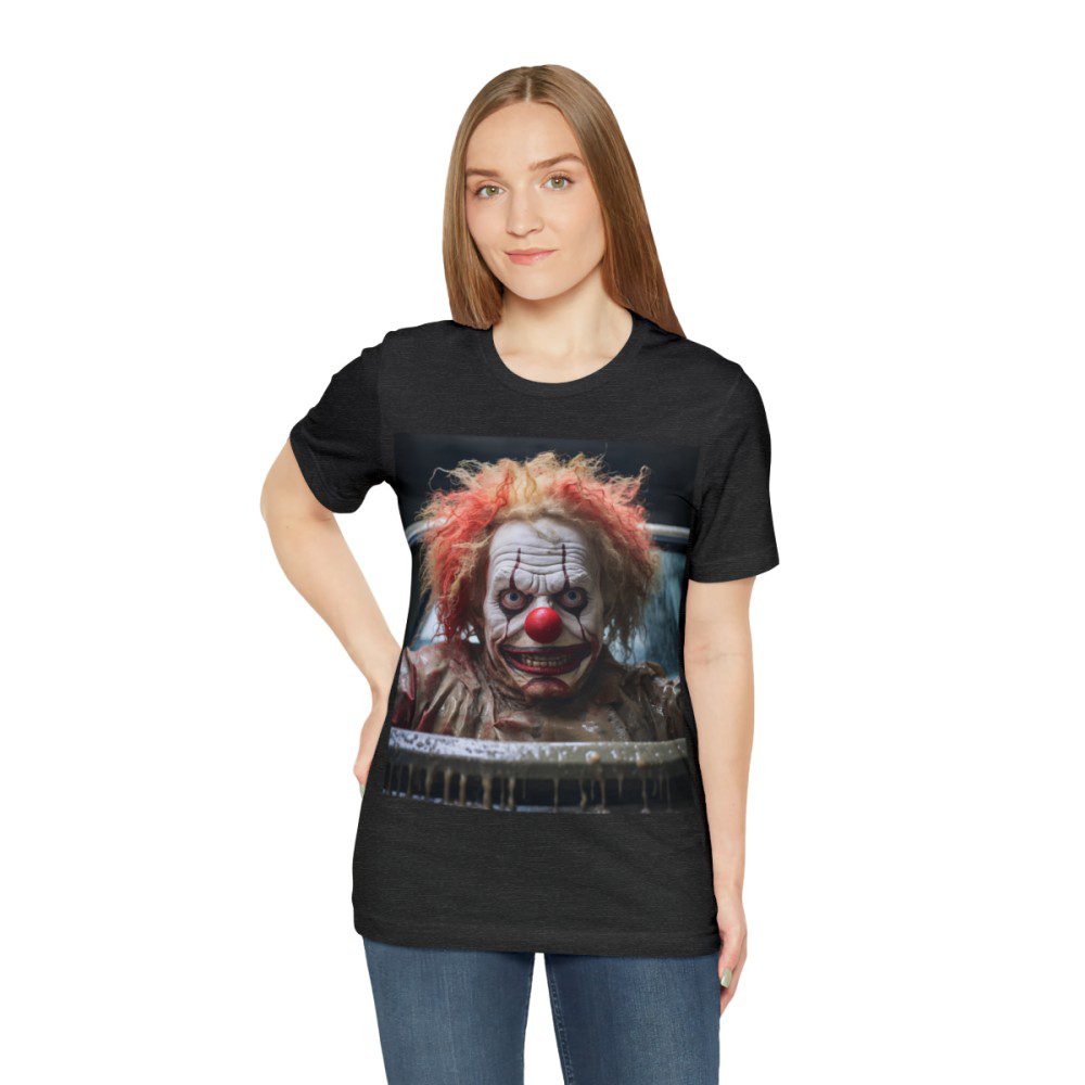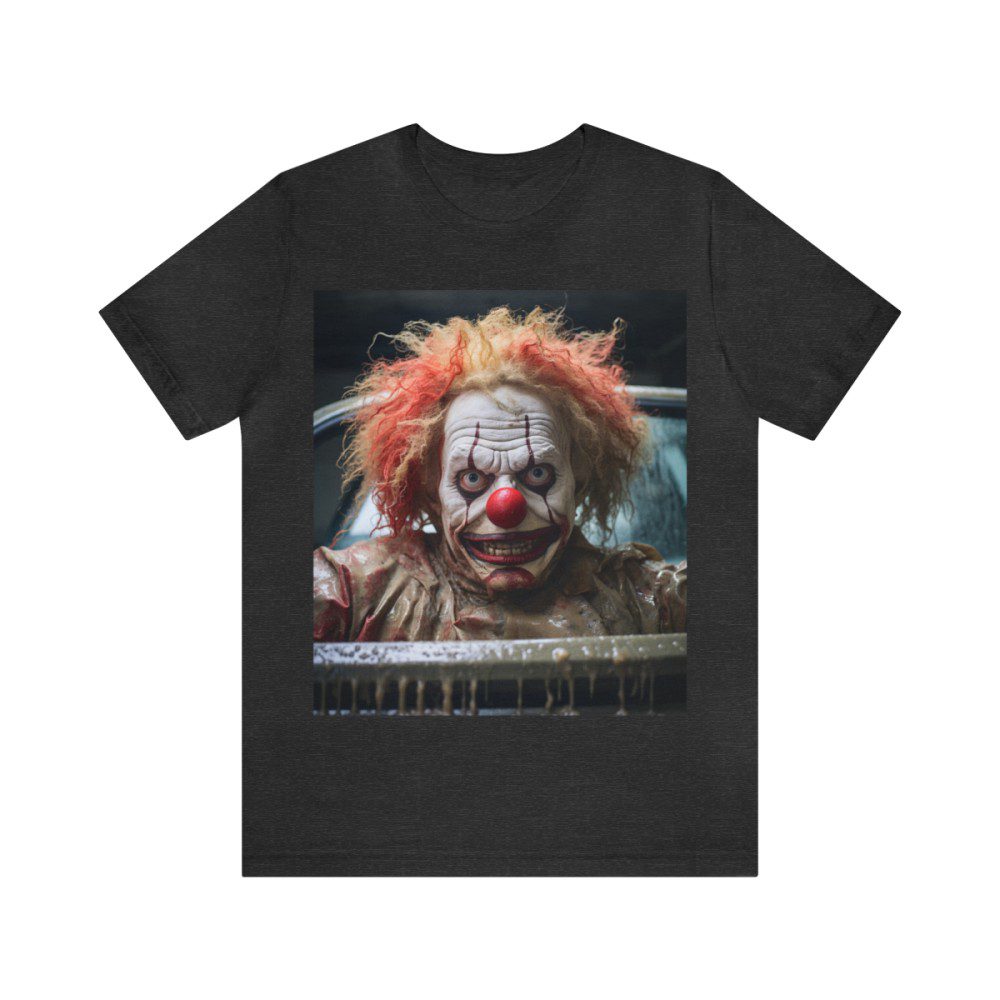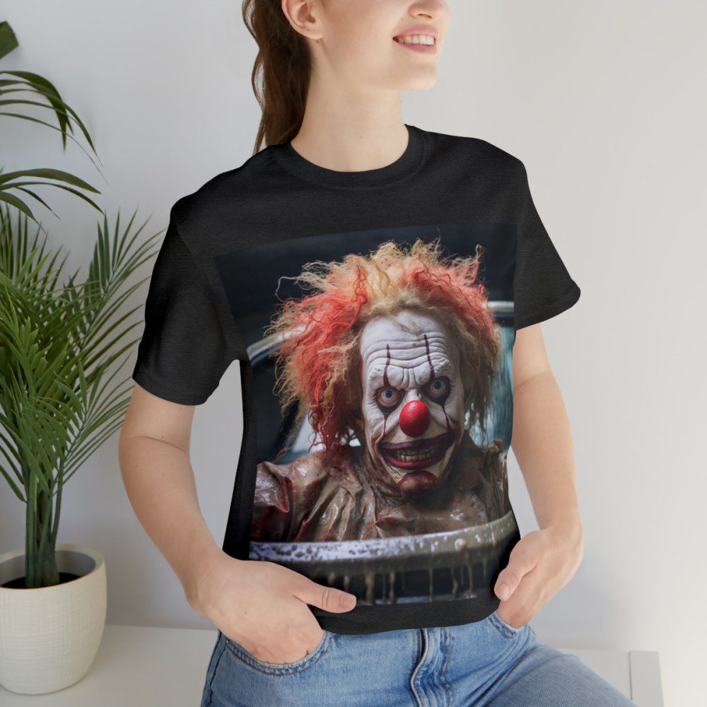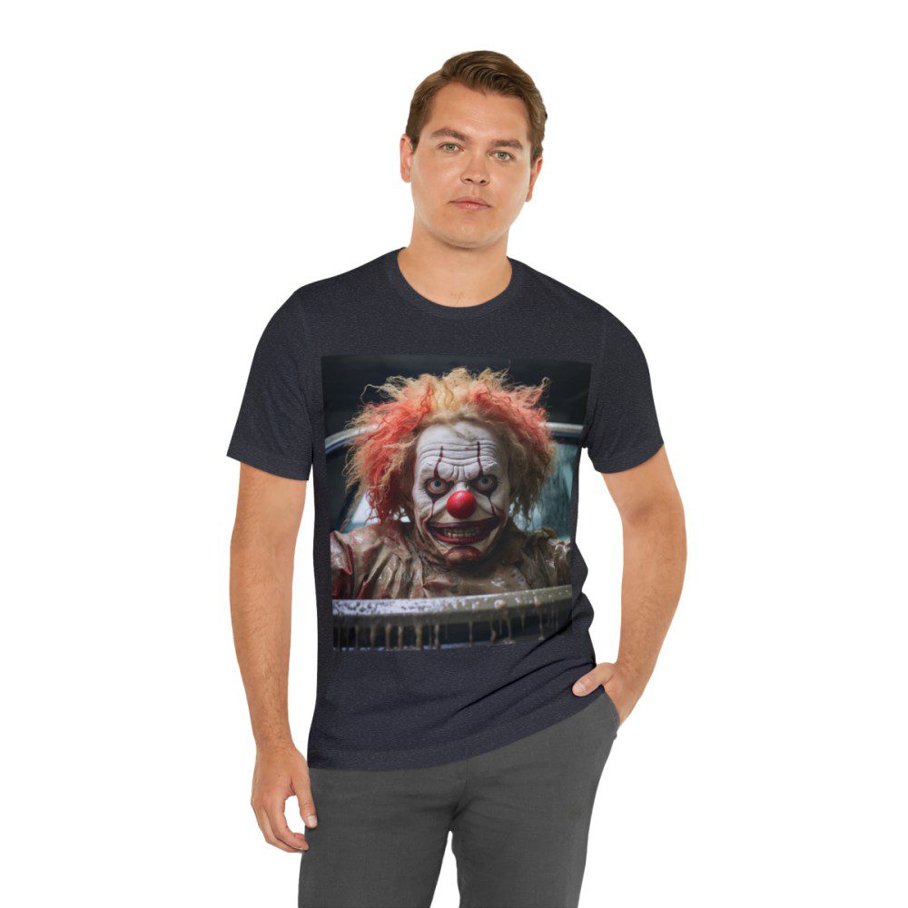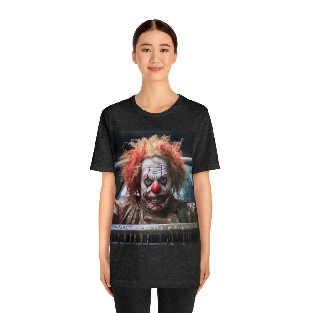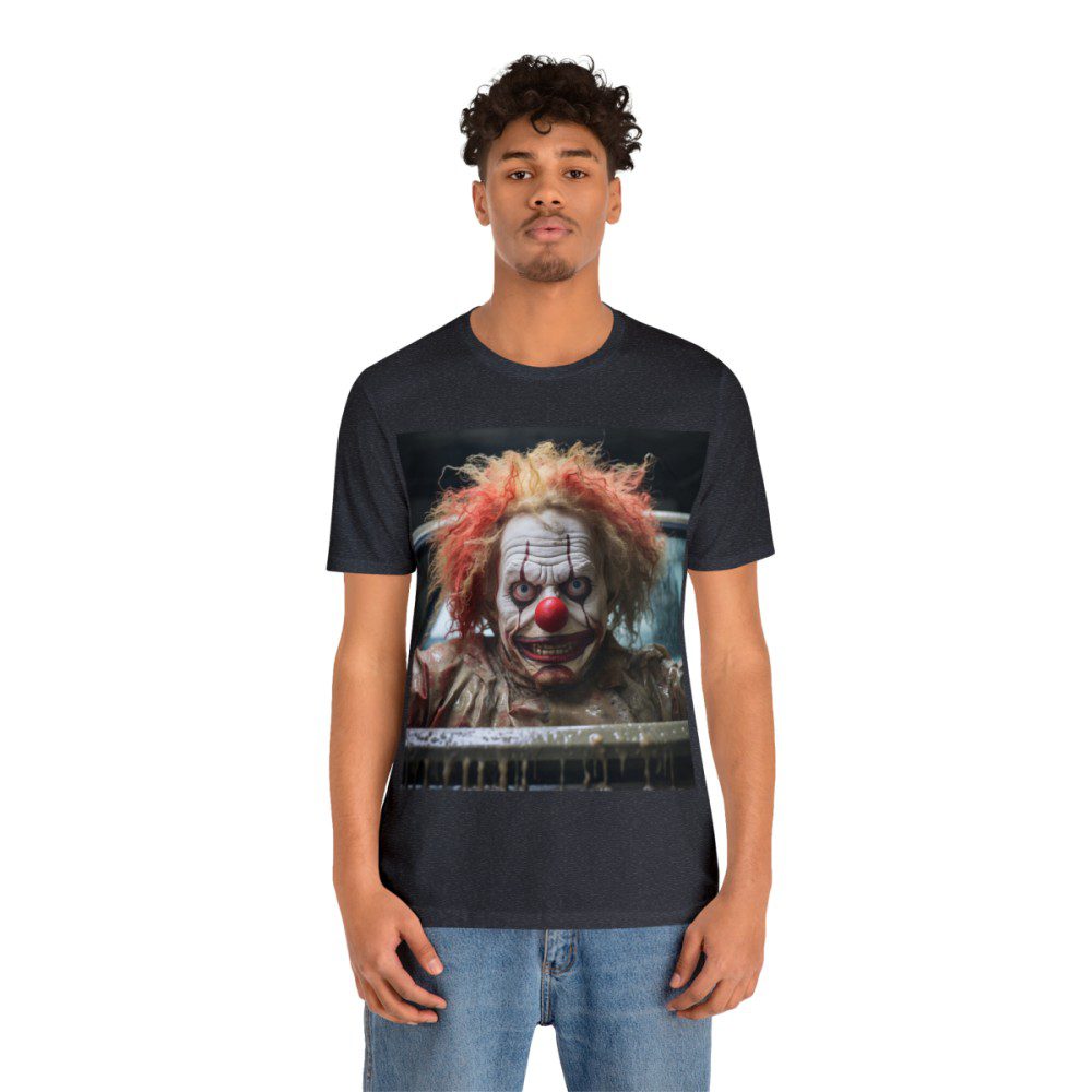 This clown is sure to elicit a response from everyone you encounter. Appearing to be menacing at first, a closer look and he seems, perhaps, just misunderstood. Either way, people will definitely notice and comment on your new shirt.