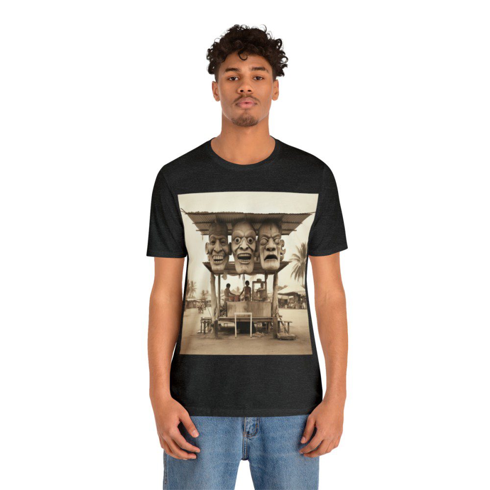 Three giant carved-wood masks serve as the signage for this vintage tiki tourist concession hut. Walk on up, grab a coconut drink, and enjoy your time in the tropical weather.