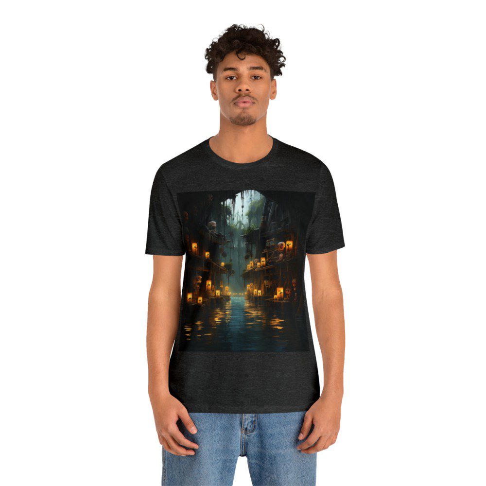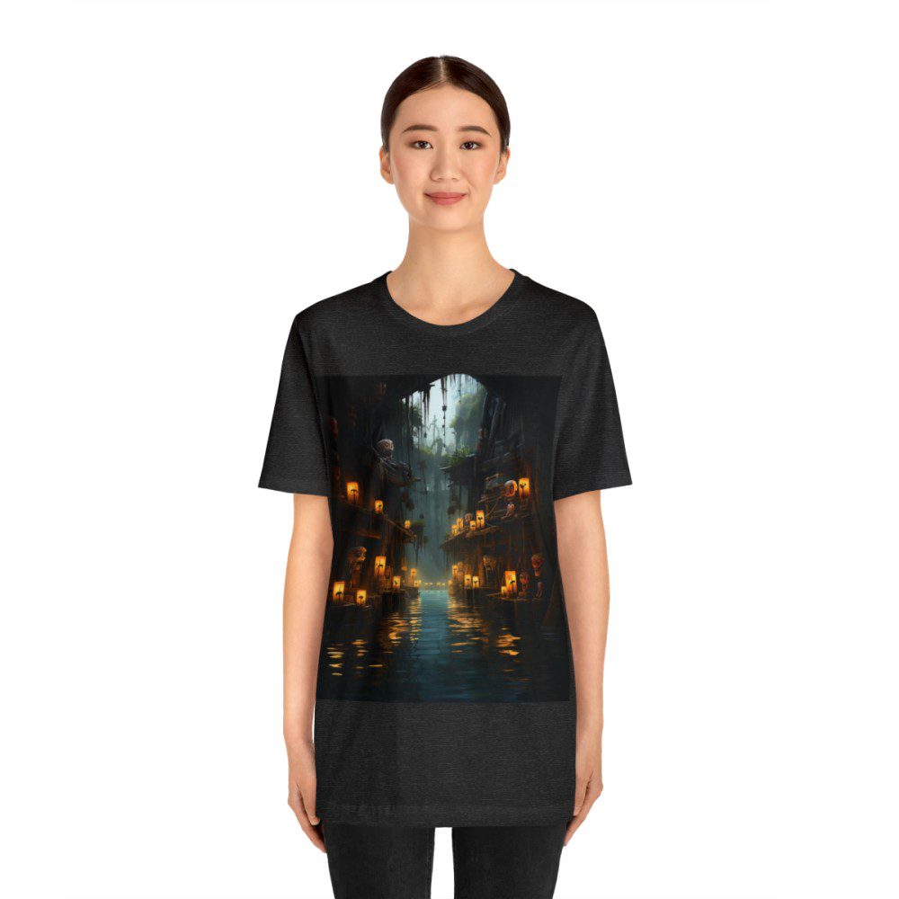 Venture into a city where the mystical intertwines with the everyday! Amidst the darkened streets, lanterns cast ethereal reflections on the water, setting the stage for a hauntingly beautiful urban scene. But look closer: skeletons roam, a masked figure lurks, and a haunting tune fills the air and echoes through the night. With this shirt, you’re not just wearing a t-shirt; you’re sharing a world of stories, each corner holding a secret waiting to be unraveled.